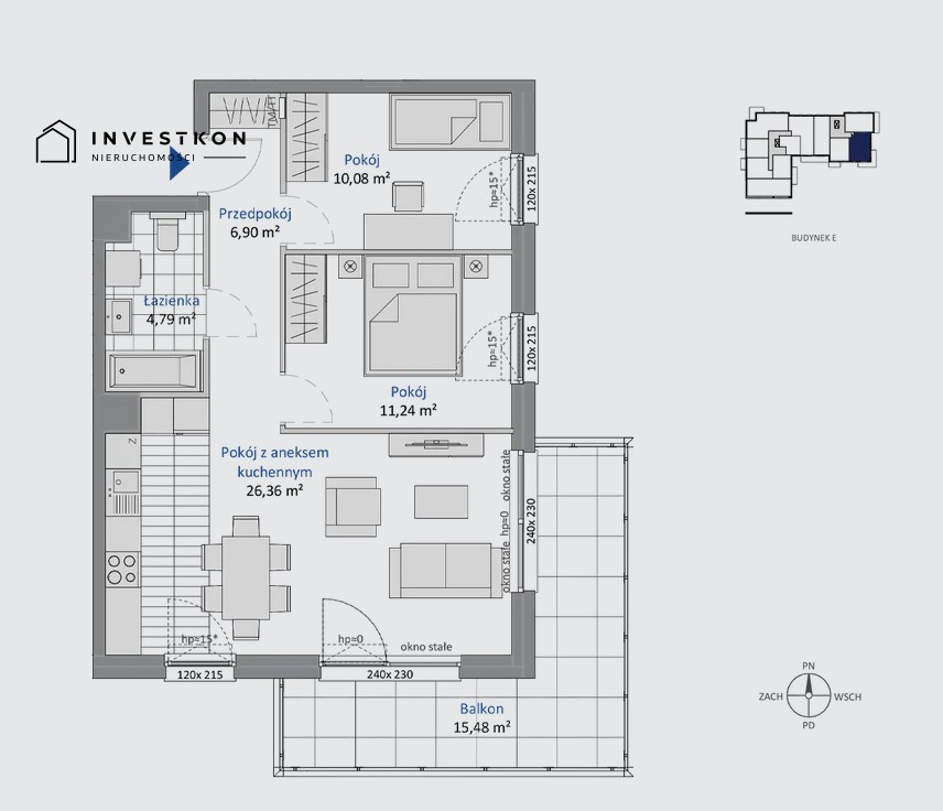 Trzypokojowe mieszkanie o powierzchni 59,37 m², położone na pierwszym piętrze, z przyjemną ekspozycją południowo-wschodnią. Przestronny pokój dzienny z aneksem kuchennym (26,36 m²) stanowi komfortową strefę codziennego życia, z wyjściem na duży balkon o powierzchni 15,48 m² - idealne miejsce na relaks, rośliny balkonowe czy kącik śniadaniowy.